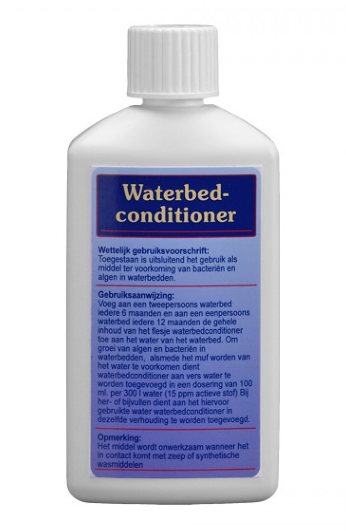 Door iedere 6 maanden een flesje waterbedconditioner aan het water in de matras toe te voegen voorkomt u bacterieën en algenvorming die voor nare luchtjes en schimmel kunnen zorgen. Eén flacon is goed voor één waterzak. Heeft u een duo matras, dan voegt u twee flesjes per keer toe.